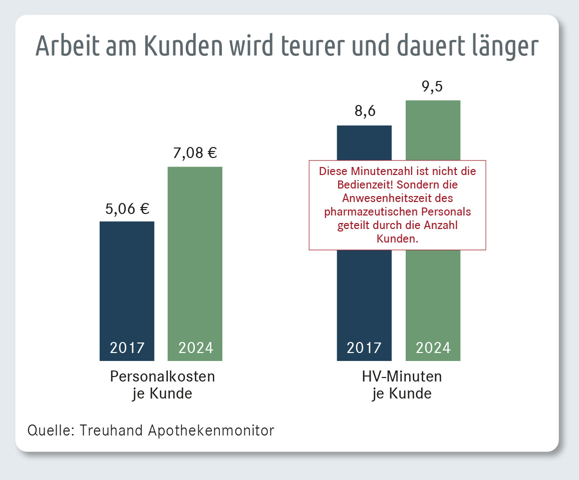 In dieser Entwicklung spiegeln sich Lohnerhöhungen, aber auch umfassender werdende Aufgaben wider. Dazu zählen komplexere Verordnungen oder zusätzliche Erklärungsbedarfe bei neuen Therapieformen. Auch organisatorische Themen wie Rückfragen bei Ärzten, Dokumentationspflichten oder das Management nicht lieferbarer Arzneimittel verlängern den Aufenthalt eines Kunden am HV-Tisch. Hinzu kommt: Apotheken übernehmen zunehmend Aufgaben, die früher kaum eine Rolle spielten – etwa strukturierte Beratungsgespräche im Rahmen pharmazeutischer Dienstleistungen. Diese Tätigkeiten sind fachlich anspruchsvoll sowie zeitintensiv und lassen sich daher nicht beliebig »nebenbei« erledigen.