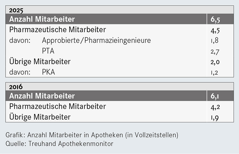 Schaut man sich Statistiken über mehrere Jahre an, lässt sich durch die veränderte Personalstruktur zum Beispiel ein Rückschluss auf zusätzliche Aufgaben ziehen. So arbeiteten 2016 rund 6,1 Vollzeitmitarbeiter in der Durchschnittsapotheke, 2025 war es fast eine halbe Stelle mehr. Die Kundenzahl wuchs in dem Zeitraum kaum, die zusätzliche Mehrarbeit wurde also vor allem für kundenferne Aufgaben benötigt. Dabei wurde vor allem auf pharmazeutisches Personal gesetzt. Deren Anzahl wuchs stärker als die Zahl übriger Mitarbeiter.